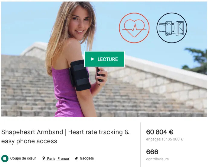 Shapeheart is the story of two entrepreneurs who could no longer stand doing sports with poorly designed and uncomfortable armbands. Thanks to a crowdfunding campaign on Kickstarter, they were able to fund their project of an armband with a detachable magnetic sleeve and an integrated heart rate sensor, testing their idea directly with consumers.